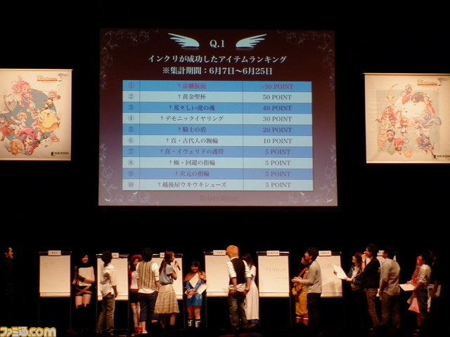 イベントではそのほか、サーバー対抗のゲーム大会などを開催。クイズ大会などを経てトップに立ったのはミストラルサーバー……だが、イベント特典アイテム(月神の翼、赤薔薇の帽子、赤富士)を決めるのはルーレットだった! もちろん上位チームには有利な条件となっているのだが、ここで全アイテム+ネクソンポイントをゲットしたのはモエンサーバー。残念ながらミストラルは外してしまい、全ゲットならず。残念でしたが皆さんお疲れ様でした!