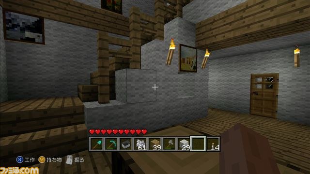 そんな感じでシュプールを紹介していると、私が材料を入れていたチェストの中身に鉱石類が少ないのを見てフレンドが「まだ、あんまり掘ってないのか?」と聞いてきた。思わぬ落下により地中に落とされたことはあったが、鉱石目当てで計画的に地下を掘り抜いたことはない。「とにかく地上で木を植えては伐採して、木材での建物作りに専念してたからなァ……」と言うと、フレンドが「よし!」とツルハシを持って、シュプールの近くから地下に掘り進み始めた。