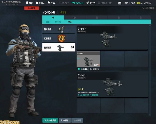 武器はメイン、サブ、近接、投擲、特殊の5種類に所有しているものをセットする。どの武器を選ぶか、どのスキルを選ぶかによって得意とするシチュエーションも変わってくるので(たとえば、室内にいることが多いステージでは航空支援はあまり役に立たない)、装備選択はプレイヤーの腕の見せ所ともなるだろう。武器はゲーム内ポイント“CR”や有料ポイントで購入・レンタルが可能。今回は試せなかったが、メイン画面にはロビーから実行できる“リボルバーガチャ”の記載や、ショップ内に“闇マーケット”の記述もあった。また、武器自体にもカスタマイズ用のオプションパーツがある。