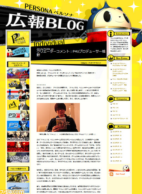 アトラスのプレイステーション3、Xbox 360用ソフト『ペルソナ4 ジ・アルティメット イン マヨナカアリーナ』が、本日(2012年7月26日)発売された。これに合わせて、広報ブログが更新。橋野プロデューサーからの発売御礼コメントが公開された。