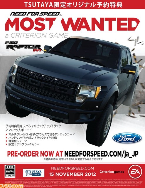 エレクトロニック・アーツから2012年11月15日に発売が予定されているプレイステーション3、Xbox 360、PC版『ニード・フォー・スピード モスト・ウォンテッド』の予約特典が発表された。また、限定法人で予約するとさらに豪華な“オリジナル予約特典”が付くことも明らかに。以下、詳細をリリースより抜粋する。