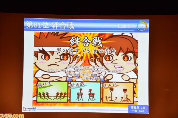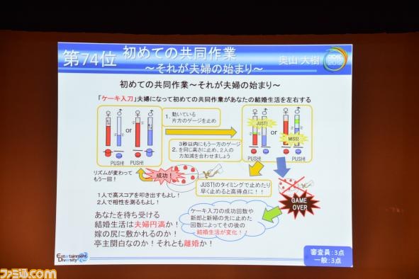 遠藤氏は最後に、「テーマである男女同時の“同時”をどうやってメカニクスに盛り込むかというゲームデザイナーと、“男女”をどうやってグラフィカルに見せるかというデザイナーの戦いでした」と、今回の“ペラ企画コンテスト”を総括した。