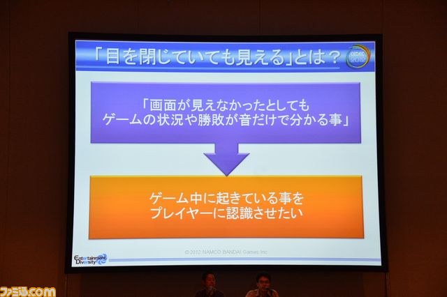 2012年8月20日~22日まで、パシフィコ横浜にて開催された、日本最大のコンピュータエンターテインメント開発者向けカンファレンス“CEDEC2012”。会期最終日に行われたセッション“目標は「目を閉じていても見える」-格闘ゲームにおける「記号性と演出の両立」の為のインタラクティブサウンド演出-”のリポートをお届けしよう。