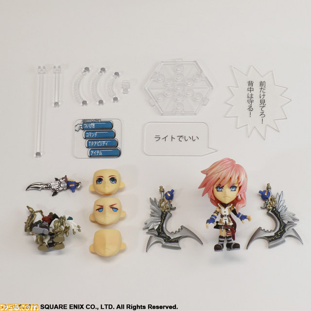 各フィギュアには、本体以外にさまざまなオプションパーツが付属。特徴的な装備はもちろんのこと、ゲーム中の名セリフを記したパネル、さらにはファンならグッとくるに違いない戦闘中のコマンドを描いたパネルも用意される。表情も複数パターン用意されているので、名シーンを本フィギュアで再現してみてはいかがだろうか?