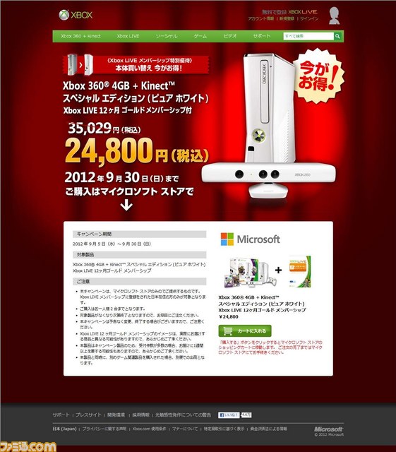 マイクロソフトストアで、Xbox 360 4GBモデル本体と、Kinect(キネクト)のスペシャル エディション (ピュア ホワイト)、さらにXbox LIVE 12ヶ月ゴールド メンバーシップをセットにしたお得な商品が販売中。2012年9月5日~9月30日までの期間限定で、通常価格35029円[税込]のところ、24800円[税込]で提供される。