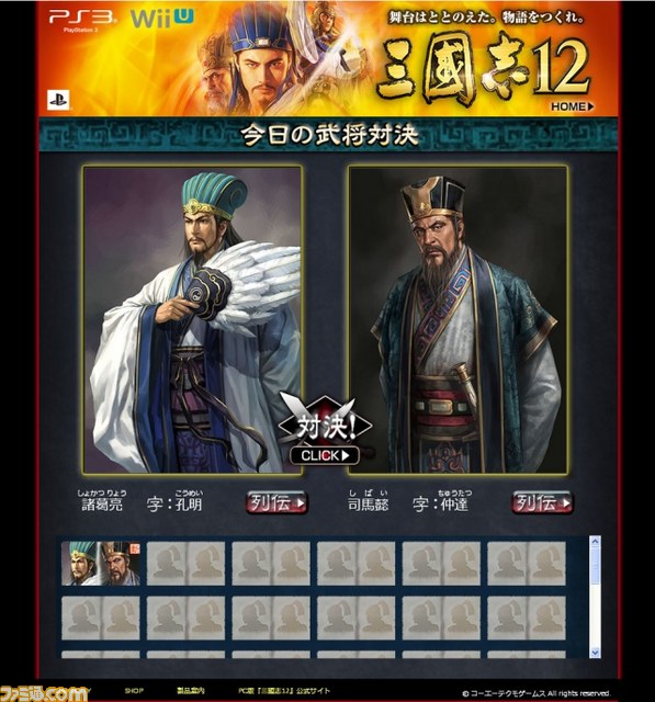なお、本日よりPlayStation 3/Wii U版『三國志12』公式サイトにて、ゲーム中に登場する武将を2人ずつ紹介する「今日の武将対決」のコーナーを開設しました。躍動感あふれる姿に一新された武将のグラフィックをお楽しみいただけるほか、彼らの列伝を紹介しています。