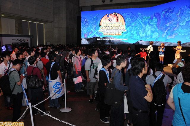 2012年9月20日~23日、千葉県・幕張メッセにて東京ゲームショウ 2012が開催。9月22日には一般日が開幕し、開場は大きな盛り上がりを見せているが、ひときわ活況を呈しているブースが! そうKONAMIブースだ。KONAMIブースでは、ソーシャルゲーム8タイトルの、ゲーム内で使用できるアイテムが取得できる“TGS限定スペシャルカード”が配布。その整理券を求める来場者がKONAMIブースに詰めかけているのだ。予定より30分前倒しして、9時30分に会場がオープンするや、KONAMIのブースにはあっという間にとんでもない人の列ができた。ソーシャルゲームのパワー恐るべし! “TGS限定スペシャルカード”でアイテムが入手できる8タイトルは以下の通り。