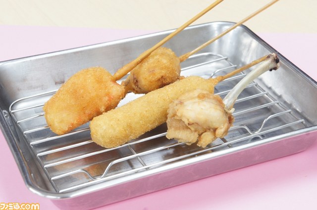 今回のコラボレーション企画は、『龍が如く5 夢、叶えし者』のサブストーリーをクリアーすると、ゲーム内に登場するオリジナルメニュー“サーモン(札幌)”、“手羽先(名古屋)”、“明太子(福岡)”の3本に“串かつ だるま”の人気メニューである、大阪名物“元祖串かつ”の1本を加えた合計4本を『龍が如く5』セットとして、2012年11月20日から期間限定で実際に販売されるというもの。
