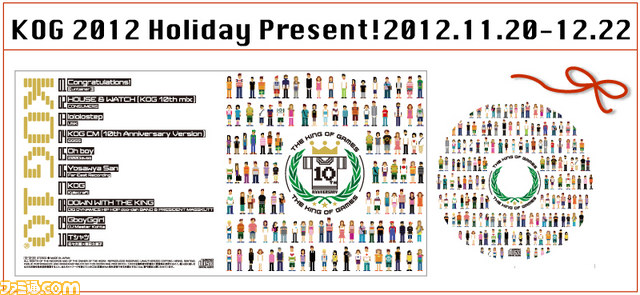 KOGS10周年を記念し、KOGとゆかりのある10人のアーティストが、KOGのためにオリジナル曲を提供。これらの曲を収録したCD(非売品の限定生産)を、2012年11月20日午後22時~12月22日午後22時までの期間中に、新作・再販すべて含むTHE KING OF GAMES商品(Tシャツ、パーカー、シャンブレーのみ)、Dot Like商品を注文した人にプレゼント。2012年12月24日お届け予定。
