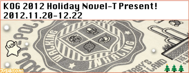 2012年11月20日午後22時~12月22日午後22時までの期間中に、新作・再販すべて含むTHE KING OF GAMES商品(Tシャツ、パーカー、シャンブレーシャツのみ)、Dot Like商品を注文した人の中から抽選で、“KOGクリスマスノベルT”がプレゼントされる。デザインは、今年発売したばかりの『星のカービィ』デザインのクリスマスver.! クリスマスに届くかも?