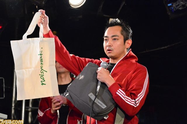 なぜかステージにカバンを持ってきている加藤氏。日によって入っているものは違うそうだが、この日はサイフ、ケータイ、ノイジークロークのエコバッグ、そしてなぜかシュークリームが入っていた。