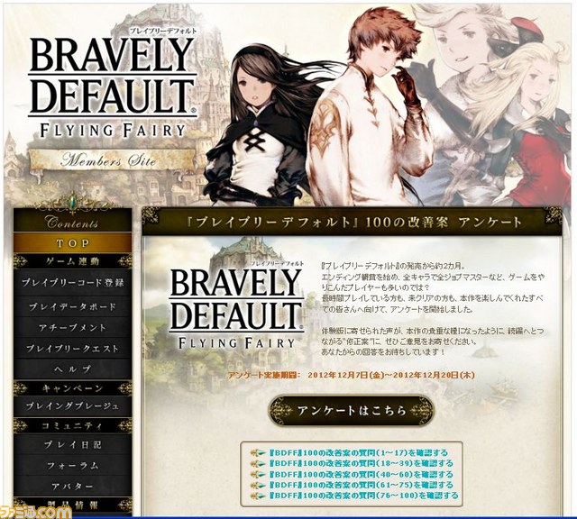 スクウェア・エニックスのニンテンドー3DS用ソフト『ブレイブリーデフォルト』(2012年10月11日発売)について、スクウェア・エニックス メンバーズの特設サイトにて、プレイヤーへのアンケート“ブレイブリーデフォルト 100の改善案”がスタートした。実施期間は2012年12月7日(金)~2012年12月20日(木)23:59。