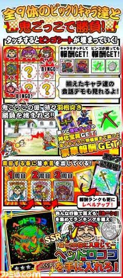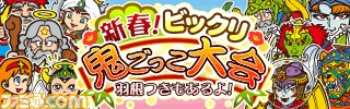 また、年末年始の特別企画として、新イベント“新春!ビックリ鬼ごっこ大会”もGREEとmixiにて開催中だ。“新春!ビックリ鬼ごっこ大会”では、プレイヤーが鬼となり全9体の大人気キャラたちと鬼ごっこで勝負。キャラをタッチしてビンコシートを埋めると豪華報酬をゲットできるのだ。さらに、タッチしたキャラとの羽根つき勝負に勝つと、“強化グッズ”や“進化法具”が入手できる。そのほかにも、いろいろな行動を取ることでもらえる“カーン”を集めてランキング上位に入れば、SSRのヘッドロココをもらえるのだ。