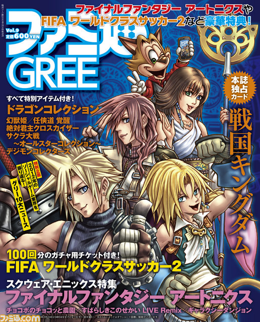ファミ通GREE Vol.9が絶賛発売中。表紙の『ファイナルファンタジー アートニクス』や『チョコボのチョコッと農園』などのスクウェア・エニックス特集は、もちろん豪華アイテム付き! また、グリーの『戦国キングダム』も完全描き下ろし限定カード、“『聖将の恋姫』伊勢姫”をプレゼント。ほか、『FIFA ワールドクラスサッカー2』の100回分ガチャチケットを始め、『ドラゴンコレクション』や『デジモンコレクターズ』、『幻獣姫』などの人気タイトルの限定アイテムや最新情報も要チェック!