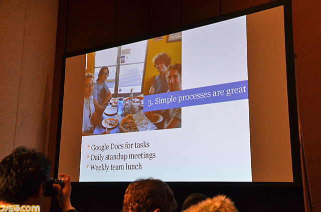 Google社が無償提供する、Webブラウザ上で文書の作成や共有が行える、“Google Docs(現在は、Google Driveへ統合)”は、個々人のタスク(ひとつひとつの仕事)管理に役立ったという。また、毎日のミーティングは“立ったまま”行うのだそうだ。ネットワークを使って情報共有を図り、ミーティングはダラダラしない、ということなのだろう。さらに、毎週チーム全員で会社持ちのランチをする、とも語っていた。オフィスの環境を離れると、いつも話さない人どうしが話す機会が生まれるのだとか。