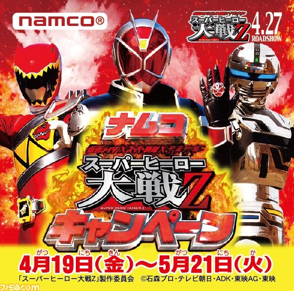 ナムコは、映画『仮面ライダー×スーパー戦隊×宇宙刑事スーパーヒーロー大戦Z』(2013年4月27日全国公開)とのタイアップキャンペーンとして“ナムコ スーパーヒーロー大戦Z キャンペーン”を2013年4月19日(金)から同年5月21日(火)まで、全国のナムコ直営アミューズメント施設約180店舗で実施する。