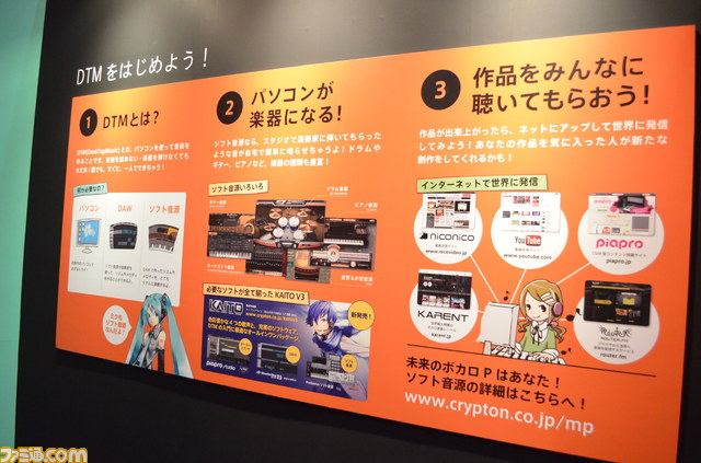 歌声合成ソフト『初音ミク』を世に送り出したクリプトン・フューチャー・メディアのブース。等身大フィギュアの展示や、初音ミクの歴史年表、コンテンツ投稿サイト“piapro”の紹介展示などが楽しめる。また、ソニー・コンピュータエンタテインメントジャパンアジアの“SmartAR”技術を使用した、プレイステーション Vita向けテクニカルデモ『Miku Miku Hockey』もプレイ可能。AR(拡張現実)空間内で、初音ミクとエアホッケー対決が楽しめる。『Miku Miku Hockey』試遊コーナーは整理券制になっているので、遊びたい人は早めに整理券をもらっておこう。