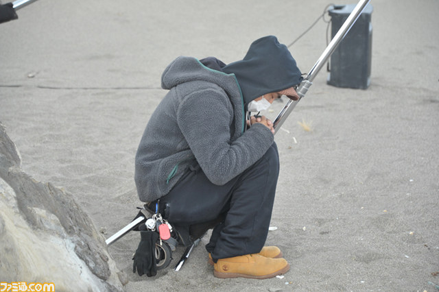 ▲続いて砂の上を歩いていくカットを撮影。カメラマンはこの体勢で撮影を行う。