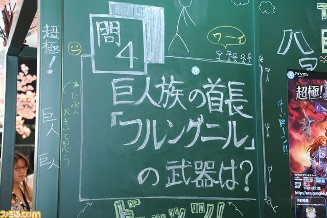 各試遊エリアは、ポスターが飾られたり、壁や柱のいたるところにチョークでおもしろポイントなどが描かれていたりと、それぞれにアピール全開。ブース背面には、現役美大生による“本気過ぎる黒板アート”のコーナー。イベント中もリアルタイムで描き続けられた本気の黒板アートに、来場者はこぞってカメラを向けていた。また、抽選で共闘学園グッズが当たるクイズラリーのクイズも各所に記されていた。中にはフェイクの問題も!?