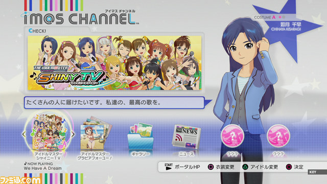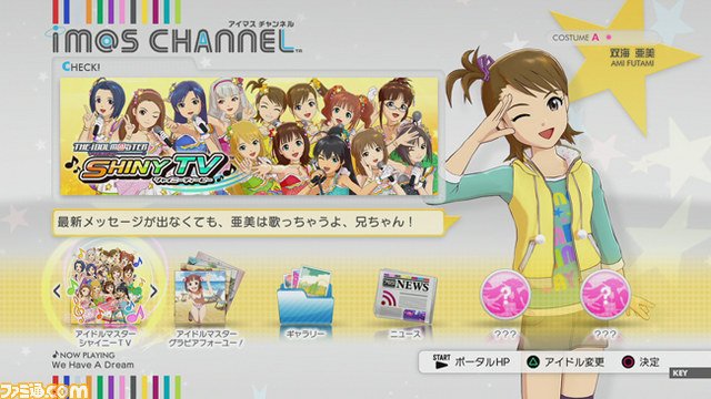 コンテンツホームアプリとは、『アイマス』に関するさまざまなコンテンツの入り口となるもの。『アイマスチャンネル』はダウンロード無料で、『アイマス』に関する最新ニュースや、同時配信となる『シャイニーTV』、『グラビアフォーユー!』、今後配信予定のダウンロード対応タイトルなどを起動する入れ物となる。そのため、ディスクを入れ替える必要もなく、ゲームを存分に楽しめるのだ。