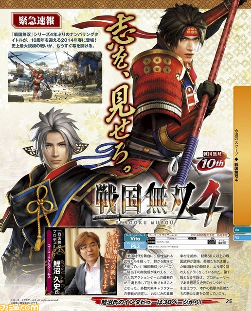 プレイステーション Vitaとプレイステーション3向けに、『戦国無双』シリーズとして4年ぶりのナンバリングタイトルとなる『4』が開発中! おなじみの真田幸村を始め、新キャラクターの真田信之や、大谷吉継を含む50名超の武将が参戦し、爽快感溢れるバトルを展開します。もちろん、キャラクターだけでなく、新要素も満載。プロデューサーの鯉沼久史氏のインタビューとともに、7ページで充実のスクープ記事をお届けします。