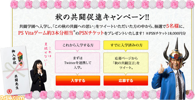 共闘学園へ入学し、「この秋の共闘への思い」をツイートいただいた方から、抽選で5名様に、PS Vitaゲーム約3本分相当(18,000円分)のプレイステーション ネットワーク チケット(PSNチケット)をプレゼントするキャンペーンを10月24日(金)から11月15日(金)まで実施いたします。これから入学される方だけでなく、すでに共闘学園に入学している生徒でも、共闘学園公式サイトから「この秋の共闘への思い」をツイートすると、キャンペーン対象者となります。