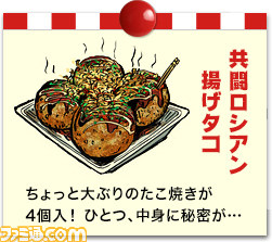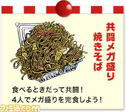 ここでしか食べることができない、共闘学園文化祭ならではの“食”のメニューが決定しました。仲間と共闘する際に重要な“助け合い”の大切さを体感できる、超ボリュームの「共闘メガ盛り焼きそば」と、自己犠牲で仲間を救うことの大切さを教えてくれる「共闘ロシアン揚げタコ」を販売します。ゲーム未経験者でも、“食”を通して共闘の素晴らしさを体験することができます。