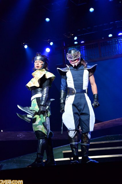 いよいよゲネプロ公演がスタート。あまりネタバレにならない程度に、本公演の模様をお伝えしよう。全体的なところで特筆すべきは、やはり舞台全体を所狭しと駆けまわる圧倒的な殺陣の迫力。要所要所でゲームでのモーションや登場した技などを忠実に再現しているのはもちろん、殺陣の合間に挟まれるセリフ中の荒い息遣いなど、舞台ならではの臨場感あふれる演技に、観客は息を飲んで見入っていた。舞台版シリーズですっかり恒例の“宴会芸”コーナー(?)も健在。今回は伊達軍と武田軍に加え、なんと豊臣軍も宴会芸を披露! 豊臣秀吉にどこまでも忠義を貫く石田三成の「どうかこの私に、宴会芸を始める許可を!」は必見です。