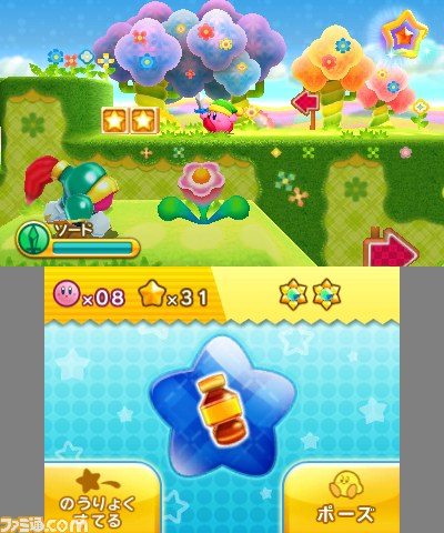 今回カービィが冒険するのは、奥行きのある、不思議なステージ。横に進んでいくだけでなく、奥と手前も行き来して、しかけを解いたり、敵と戦ったり、ときにはニンテンドー3DS本体をかたむけたり。新しい冒険を存分に楽しもう。