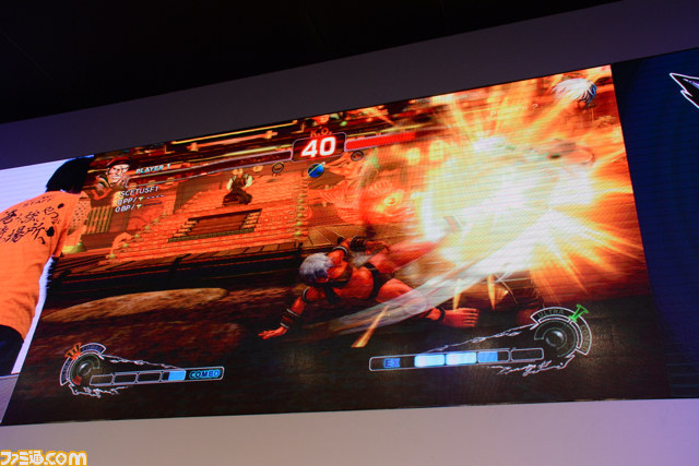 ここで、特別ゲストとして、プロゲーマーのGamerBee氏とRB氏が登場。本作で新しくなったチームバトルの機能を使って、小野氏&綾野氏のカプコンチームと対戦を行う。ちなみに、この対戦は実際にPSNを通じた対戦だったが、とくにラグなどはなく、対戦相手がその場にいることも相まって、ネットワーク越しの対戦とは思えない滑らかさだった。そして、対戦の内容はと言うと、それぞれが本作の新キャラクターを選択し、最初にポイズンを使った小野氏とヒューゴーを選んだRB氏の試合で、RB氏が勝利。ここで、小野氏が「RBに勝ったら、綾野にお年玉をあげる!」と宣言すると、小野氏との対戦で体力が減っていたRB氏は、ロレントを使う綾野氏にあえなく敗退。小野氏からのお年玉が……と思いきや、「体力引き継いでるんだから、やっぱりGamerBeeに勝ったらに変更」と、お年玉は延期。続いて、綾野氏とエレナを使うGamerBee氏の対戦。前の戦いから体力が減っている綾野氏は、善戦をするも、GamerBee氏のエレナの前にあえなく敗退。お年玉どころか、小野氏から「ふがいない負けかたをしたから、アップグレード版のプレゼントは20名に変更!」と、綾野氏の自腹負担額が増える結果になっていた。
