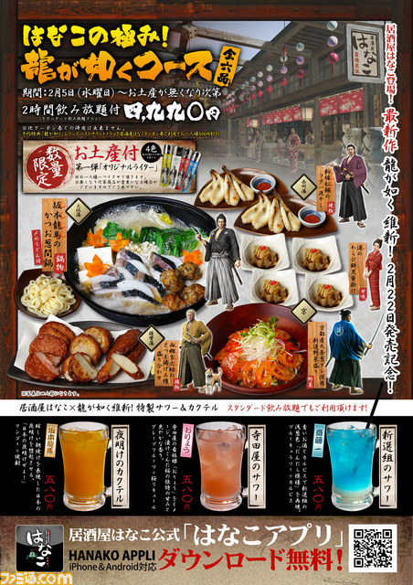 本コラボレーションは、居酒屋はなこ全店でコラボメニューが食べられたり、豪華賞品が当たるプレゼントキャンペーンが実施されるほか、渋谷南口店限定で『龍が如く 維新!』バージョンの坂本龍馬像が設置されるなど、盛りだくさんの内容となっている。