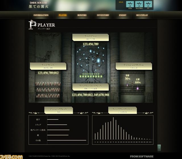 これは、同社の『アーマード・コア ヴァーディクトデイ』でも行われたサービスで、全世界の『DARK SOUL II(ダークソウルII)』プレイヤーから集計した行動記録を、さまざまなデータとして閲覧できる統計情報サイトで、プレイステーション3&Xbox 360版の発売日、3月13日からスタートする予定。会員登録は無料。