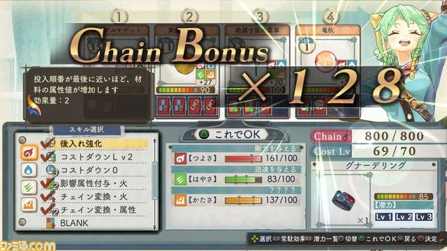 “調合”スキルには、火・水・風・土の4つの属性があり、属性が同じスキルを続けて使えば“Chain”がつながる。スキルを使う順番や、材料の投入順を入れ替えることで、“Chain”がつながるように工夫しよう。