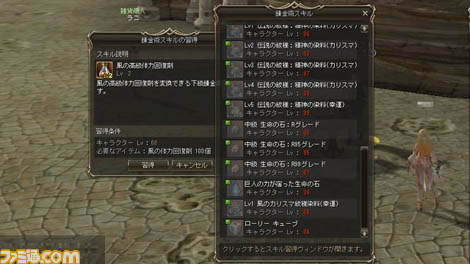 錬金術は、レベル40以上で特定のクエストを進めることで使用できるようになる。工程は“調合”と“変換”に分かれ、先に不要になったアイテムを最大3種類登録し、それに見合った数量のウィンドストーンに換える“調合”から始めなければならない。一定量のウィンドストーンを確保したら、それを媒体に、指定された材料といっしょに“変換”することで、さまざまなアイテムを生産できる。なお、“調合”に際して、クエストアイテムやトレード不可のアイテムなど一部の例外を除けば、ほとんどのアイテムは登録が可能。
