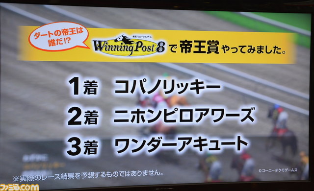 抽選会場横のモニターには『ウイニングポスト8』のレースシーンを使用したシミュレーション映像が映し出されていた。本物さながらの実況と映像で、“帝王賞”のレースがゲームで展開されていた。