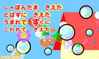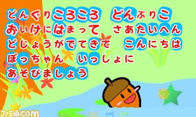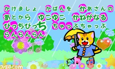 本作では、なじみのある有名な童謡がメロディ、歌声、ひらがなによる歌詞で演奏され、同時にタンバリン、ラッパ、トライアングル、太鼓の4つの楽器もタッチ操作で演奏できる。音楽や画像との触れ合いを通じて、リズム感の育成、ひらがらの習得などが育める。