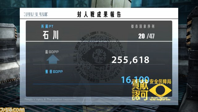 アクセサリサービスから“対人ボランティア参加申請”を選択することで、インターネットを通じ全国の咎人と対戦できる。ルールは“市民探索”と“敵軍排除”が用意されていて、戦績に応じて所属しているPT(パノプティコン)にGDPPを納品可能。同じPT同士でチームを組めば、敵対PTとのGDPPに差をつけることができる。
