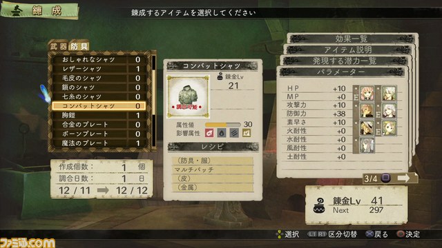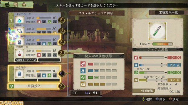 調合や錬成では、スキルを使用することが可能。スキルを使うことで、アイテムが持つもともとの素質をアップさせたり、新たな効果を付加させることもできる。