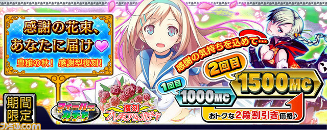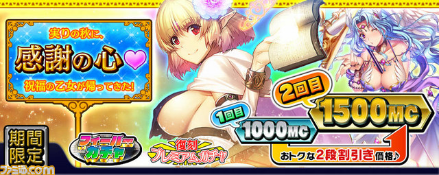 上記期間中に日ごろ、『ミリオンアーサー』をプレイして下さっているすべてのアーサー王への感謝の気持ちを込めて“感謝型復刻ガチャ”を設置させていただきます。価格も日ごろの感謝の心を表し、2段階割引設定となっております。1回ガチャは通常300MCの所、初回100MC、11連ガチャは通常3000MCの所、初回が1000MC、なんと2回目も1500MCです! とってもかわいい祝福の乙女をあなたの円卓に迎え入れませんか?
