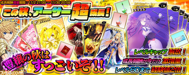 この秋、“アーサー超成長!”として、アーサー成長促進キャンペーンを実施いたします。レベルキャップを解放し、キャンペーン期間中のみ新規登録時の初期アイテムを増量、そしてレベル60までは獲得経験値がなんと2倍となり、成長報酬も激増量しています! アーサーを成長させるなら今しかない! といったキャンペーンになっております。実りの秋はすぐ目の前! ぜひ、この機会をお見逃しなく。