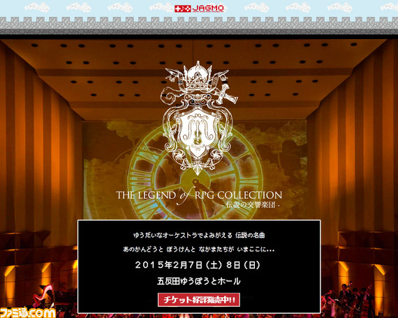 JGマーケティングは、クラウドファンディングプラットフォーム“ShootingStar(シューティングスター)”にて、JAGMOの主催により2015年2月7日(土)、8日(日)に開催予定のフルオーケストラ公演“第1回 THE LEGEND OF RPG COLLECTION -伝説の交響楽団-”の限定チケットを販売し、公演を応援するプロジェクトを、本日2014年12月10日(水)より開始した。