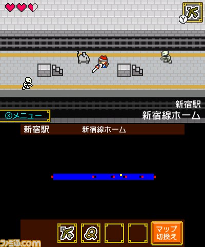 ニンテンドー3DS版『新宿ダンジョン』では、基本的なゲーム性はそのままに、ニンテンドー3DSならではの操作性、2画面をつかったインターフェイスはもちろんのこと、新しい謎解きや、やりこみ要素を追加しています。