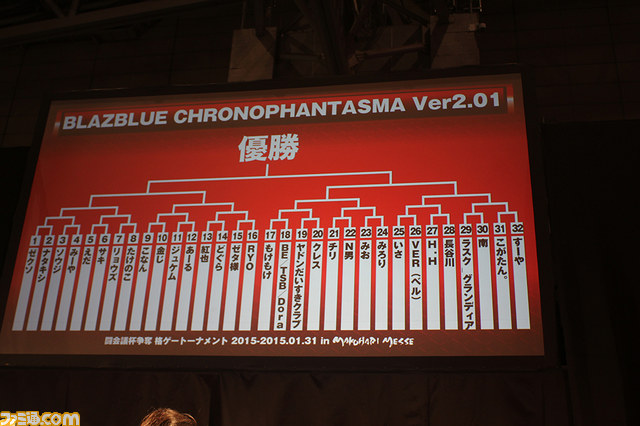 大会は32名から一気にベスト4を選出するまで一気に進められた。その中で、ソウジ選手は千葉の強豪ジン使いのみーや選手が、どぐら選手は公式全国大会常連の紅也選手が1回戦で撃破するなど、「過去の実績だけでは勝ち上がれないぞ」というような大規模大会で優勝経験のない選手の活躍が多くみられた。そんなきびしい大会のベスト4に残ったは、1回戦でソウジ選手を破った千葉のやる気勢“みーや”選手(ジン)、『ブレイブルー』をメインでやり込むプロゲーマー“BE/TSB/Dora”選手(バング)、闘劇優勝など大規模大会の常連プレイヤー“こなん”選手(ツバキ)、さまざまキャラクターを使いこなしてつねに高段位をキープする古豪“いさ”選手(タオカカ)の4名。前バージョンまでは関西のプレイヤーが上位を占めることが多かったが、今回はベスト4すべてが関東のプレイヤーという結果に。