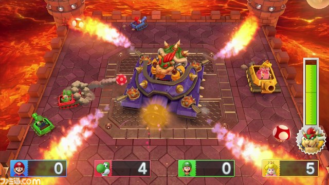 クッパとマリオチームに分かれて遊ぶ1対4の新モード。クッパはひたすらマリオたちを追いかけて攻撃。対するマリオチームはその攻撃を振り切りながら、協力してゴールを目指します。