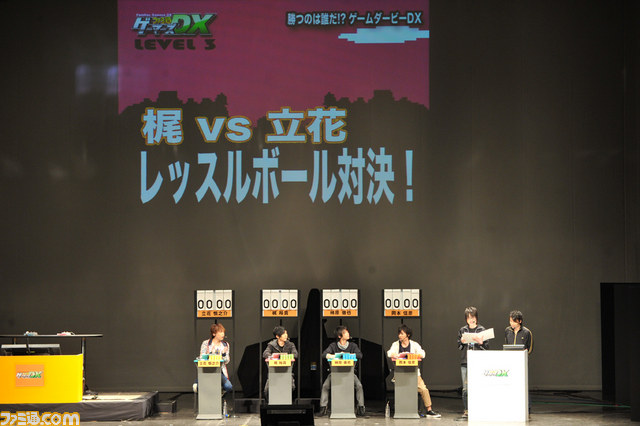 最初の対決は、梶さんvs立花さんによる『レッスルボール』(バンダイナムコゲームス)。サッカー、ラグビー、アメフトなどのスポーツが合体したアクションスポーツゲームで、先に4点を先取した方が勝者となる。ボールを奪ってゴール(もしくはタッチダウン)を行うと点が入る……と聞けば一見ふつうのスポーツゲームに見えるものの、なんと本作はタックルやドロップキック、空中殺法などの過激な攻撃で敵をダウンさせることも可能(笑)。ゲスト4人中3人が立花さんを勝者に予想する中(ちなみに、プレイヤーは自分以外に賭けることが不可能)、本気モードでメガネをかけた立花さんが、1ラウンド&2ラウンドを、それぞれ1-0で先取。3ラウンドで立花さんのメガネを奪った梶さんが2点を返したものの、4ラウンド目で立花さんが一気に3点が加点される“タッチダウン”を披露し、最終結果は5-2で立花さんが勝利を収めた。