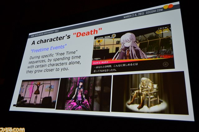 さて、生命を吹き込むキャラクター作り。それにはこれまで語ってきたほかに、もうひとつ重要な要素があるという。それはキャラクターの“死”。言うまでもなく『ダンガンロンパ』では、キャラクターの“死”が大きな要素を占めるが、キャラクターへの喪失感をプレイヤーに感じてもらうために、小高氏らは“好感度イベント”を考えたのだという。これは、メインのキャラクターといっしょに過ごすことで好感度が上がり、過去のエピソードが聞けたりするというもの。さらに好感度がマックスになると、特殊スキルが手に入るといった、ゲームプレイ的なアドバンテージもある。ただし、プレイヤーはつぎ誰が死ぬかを知らない。なので、せっかく好感度を上げていたキャラクターが突然死んでしまうこともある。「むしろそれが狙い」と小高氏。せっかく好感度を上げていたのに死んでしまうという喪失感を、プレイヤーに強く感じてもらうためのシステムだというのだ。キャラが死んですべてが終わるというわけではなくて、聞きそびれたエピソードもあるので、そこでキャラクターに深みを持たせられるのだという。“好感度システム”は、キャラクターを中心に考えていたからこそのシステムというのだ。