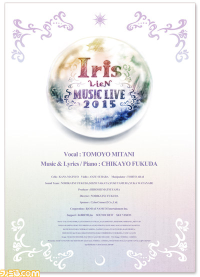 株式会社サイバーコネクトツー(本社:福岡市博多区、代表:松山洋)では、2015 年4 月25 日(土)、マウントレーニアホール渋谷 プレジャープレジャー(東京都渋谷区道玄坂2 丁目29 番5 号 渋谷プライム6F)に於いて開催予定の『LieN-リアン- MUSIC LIVE 2015 Iris』での演奏楽曲の一部と記念グッズの詳細を発表いたしました。