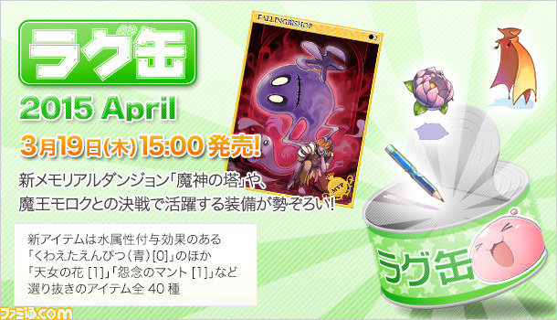 ガンホー・オンライン・エンターテイメントは、サービス中のPC用オンラインRPG『ラグナロクオンライン』において、2015年3月19日(木)15時より“ラグ缶2015 April”を発売する。