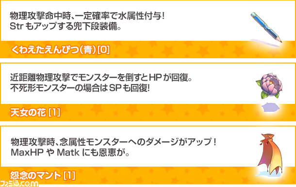 新登場となる装備アイテムは一定確率で水属性を付与する兜下段の装備「くわえたえんぴつ(青)[0]」に、不死形モンスターに強い「天女の花[1]」、念属性へのダメージがアップする「怨念のマント[1]」の3種類です。他、前述した悪魔形モンスターや火属性の対策ができる装備アイテムが勢ぞろいしています。魔法ダメージを大きく上げてくれる効果を持つ「堕ちた大神官ヒバムカード」もゲットしたい一品ですね。