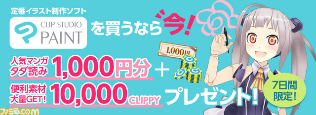 併せて、3月25日までに「CLIP STUDIO PAINT PRO ダウンロード版」をご購入いただいた方にはもれなく、最新の人気マンガが無料で読める割引クーポン 1,000円分(※2)と、プロクリエイター御用達の素材を、無料でたくさんダウンロードできるポイント10,000CLIPPY(※3)をプレゼントするキャンペーンを開催中です。